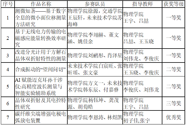 全国大学生物理实验竞赛(创新)激发了我校学生对大学物理和物理实验课程的学习兴趣与潜能。通过组织和指导学生备赛参赛,在实践中培养学生的创新精神和实践能力,在竞争中提升学生的团队协作意识和综合素养,我校物理实验教学改革不断深化,这为提高物理实验教学质量和创新型人才培养质量提供了新途径。